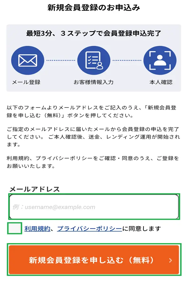 メールアドレスを入力して、利用規約、プライバシーポリシーを読み、
